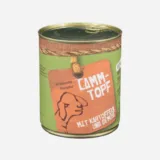 60% Muskelfleisch, 30% Innereien vom Lamm, 1,5% Rind, Möhren, Zucchini, Reis