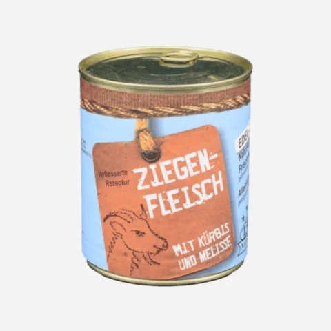 40% Muskelfleisch, 25% Innereien von der Ziege, Karotten, Kürbis, Melisse, Spirulina